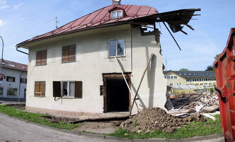 Das seit 1998 leer stehende »Marienheim«, zwischen Feuerwehr und Parkgarage gelegen, wurde jetzt abgerissen. Das historische Gebäude, welches 200 Jahre lang ein Nachbar des Möggenried-Hauses war, wich nach heftigen Diskussionen im Stadtrat dem Ruf der Feuerwehr nach Parkplätzen für ihre Mannen. Und so übernahmen nach den Politikern dann am 15. September dieses Jahres die Spezialisten einer bekannten Abbruchfirma das Kommando und rückten mit schwerem Gerät an. Nun ist der Platz am Mühlenweg 5 leergefegt, und das Abbruchmaterial professionell entsorgt. Wir mühten uns einige Tage lang mit der Demontage von altem Gebälk und Bodendielen aus dem Marienheim, das sich in direkter Nachbarschaft befindet. Wir möchten für die Wiederherstellung nicht moderne Massenware aus dem Baumarkt verwenden. Damit lässt sich zwar schnell und billig reparieren, aber wir versuchen, möglichst viel an authentischer Bausubstanz zu sichern und mit alten Werkstoffen zu rekonstruieren. Doch an die kommt man eben nur bei Demontageaktionen entsprechend alter Gebäude. Nur gut, dass noch ein paar »Reliquien« aus dem Marienheim gerettet wurden und im Möggenried-Haus die Erinnerung an die vergangenen Zeiten weiterleben lassen. Schließlich hat manche Sonthoferin hier am Mühlenweg die Schulbank gedrückt und von dort stolz ihr Zeugnis nach Hause getragen. Als Besonderheit konnte ein alter handbemalter Dielenboden aus dem Schwesternheim gerettet werden, der im Möggenried-Haus wieder zu Ehren kommen könnte.
