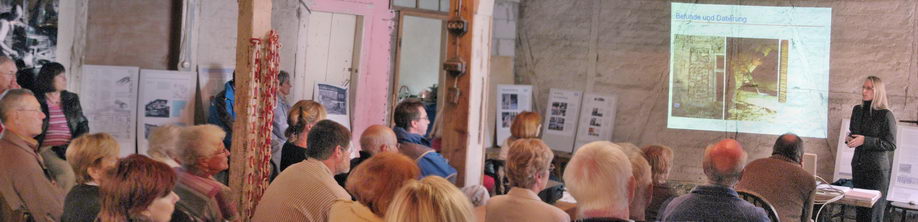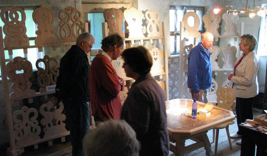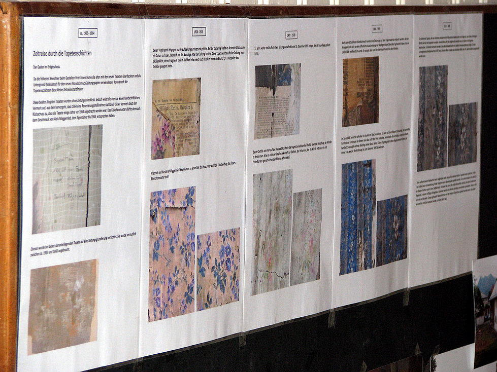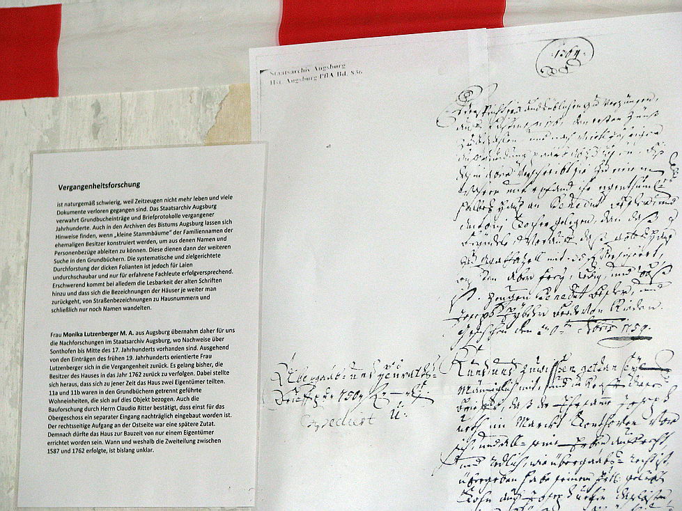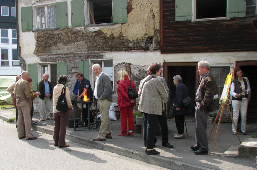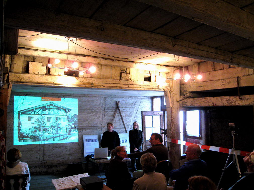 Es fanden sich rund 200 Geschichtsinteressierte ein, manche lauschten den Vorträgen des Architekten Claudio Ritter und der Dipl. Ing Elke Nagel von der TU München, die über ihre Tätigkeiten und die Aufgaben den Denkmalschutzes berichteten. Interessantes erfuhren die Besucher zu den Seminararbeiten der Studentengruppe der TU München, die im vergangenen Juli im Möggenried-Haus forschte und dabei verschiedene Nutzungskonzepte für das alte Haus erarbeitet hatte. Auf 12 Flip-Charts wurden die Ausarbeitungen der angehenden Architekten präsentiert. Die kreativen und detaillierten Vorschläge reichten vom Bürgerhaus, über ein interaktives Museum bis zum Institut für Handwerk und Kunst. Die Konzepte berücksichtigten die historische Verträglichkeit einer Nutzung und eine sinnvolle Einbindung in die wirtschaftlichen und kulturellen Gegebenheiten von Sonthofen. Das erfolgreiche Studienkonzept soll weitergeführt werden. Zudem informierte ein Flyer zum Möggenried-Haus über die bisher erlangten Forschungsergebnisse und die Geschichte des historischen Gebäudes. Neues gabe es auch zu der Besitzerchronologie. Frau Monika Lutzenberger M.A. aus Augsburg übernahm die Durchforstung der Dokumente des staatlichen Archivs in Augsburg und des Bistums Augsburg. Es gelang ihr, die Besitzer seit Mitte des 17. Jahrhunderts zu erforschen. Die ältesten bislang bekannten Eigentümer des damals in zwei Wohneinheiten geteilten Hauses waren Michael Aniser und Sebastian Ueth, dessen Sohn Nagelschmied war und der im Jahr 1765 Eigentümer wurde. Im und vor dem Haus tauschten die Schaulustigen Gedanken aus und ältere Besucher erinnerten sich an manche Begebenheit im Möggenried-Haus. Zum Klang des Schmiedehammers von Franz Hiller, den barocken Holzschnitzarbeiten von Hermann Obenauer und Thomas Gärtners, z. T. mittelalterlich anmutenden Kunstwerken schienen jene vergangenen Zeiten wiederzukehren, als in Nagelschmiede und Holzwerkstatt Leben war und geschäftiges Treiben stattfand. Ausgestellt war eine Zeitreise durch die Tapetenschichten im unteren Gaden. Sie zeigte bis zurück in die Mitte des 19. Jahrhunderts, an welchem Wandschmuck die ehemaligen Besitzer zu ihrer Zeit Gefallen fanden. Auch einige historische Schlösser fanden Besucherinteresse. Auf seinem 3-Zentner Amboss schmiedete der Meister des Eisens Franz Hiller Bieröffner, Nägel und Hufeisen. Die Ausstellung Thomas "Chancy" Gärtners phantastische Zeichnungen mit zum Teil schauerlichen Motive, mit meisterlicher Hand gezeichnet. Die Ausarbeitungen des Studienseminars, das im Sommer im Haus geforscht hatte, wurden von Frau Dipl. Ing. Elke Nagel beim Vortrag und auf DIN-A2 Karton präsentiert. Der Altmeister Hermann Obenauer erklärte Interessierten die Motive seiner rund 40 verschiedenen Stuhllehnen, deren geschnitzte Motive, wie Doppeladler, Schlangen, Fratzen oder Glückssymbole, heidnischen Ursprunges sind und für die mittelalterlichen Menschen jeweils eigene Bedeutungen besaßen. Auch eine Kopie aus den Grundbüchern des Staatsarchivs Augsburg war zu sehen. Für Kundige sind solche alten Schriften kein Problem, die zwar schön geschwungenen aber für Laien kaum lesbar sind. Besondere Kenntnisse bei den Nachforschungen verlangt auch die Suche nach den Pfaden durch die verschiedenen Folianten wie Findbuch, Literalien, Briefprotokollbändern, Steuerregistern.