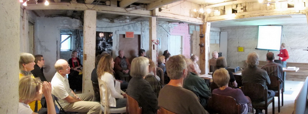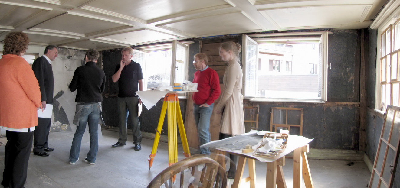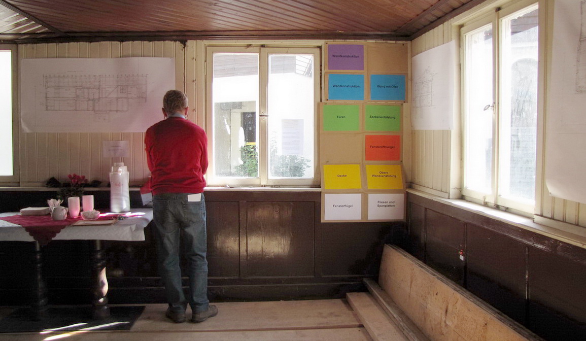 Dipl. Ing Elke Nagel von der TU München berichtete über die Forschungen des Studentenseminars, das auch in diesem Jahr wieder Studien betrieb und verschiedene Konzepte zur Wiederbelebung des Hauses erarbeitete. Architekt Dipl. Ing. Claudio Ritter erklärte den Zuhörern unter anderem die Untersuchungsergebnisse der Voruntersuchungen und dem überraschenden Ergebnis der energetischen Forschung. Im Obergeschoss erfuhren die Besucher von einer angehenden Wissenschaftlerin der TU München von den Methoden zur Restaurierung alten Wandschmucks und Reinigungstechniken von Tapeten. An verschiedenen Stellen schimmerte die alte Tapete in der oberen Stube wieder in ihrem alten Glanz aus längst vergangener Zeit.