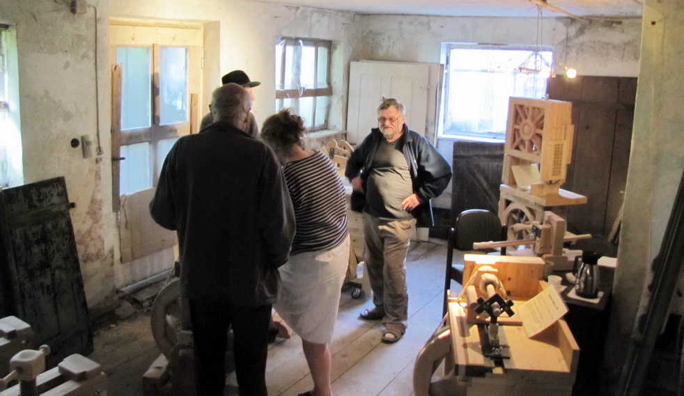 Der Tüftler und Holzkünstler Hermann Obenauer stellte seine Schreinerwerkstatt aus, die er in akribischer und mühevoller Arbeit in den vergangenen 2 Jahren anhand alter Zeichnungen und Bilder vollständig und funktionstüchtig nachgebaut hat. Im Raum mit den nur mit Muskelkraft betriebenen Maschinen wie Bandsäge, Dekupiersäge, Drehbänke, Furnierpresse, Profilholzmaschine und Abkantmaschine konnten die Besucher eine Vorstellung von der erstaunlichen Technik des 17. Jahrhunderts gewinnen, als der Maschinenbau noch in den Kinderschuhen war.