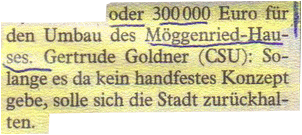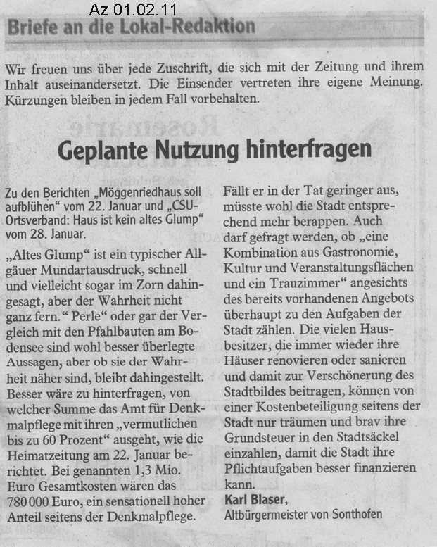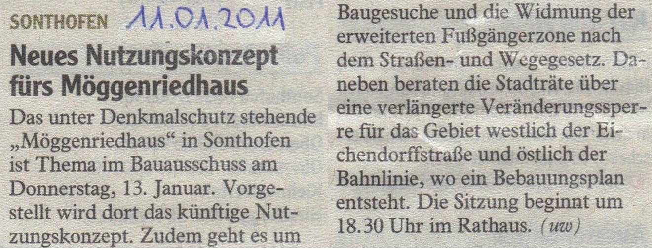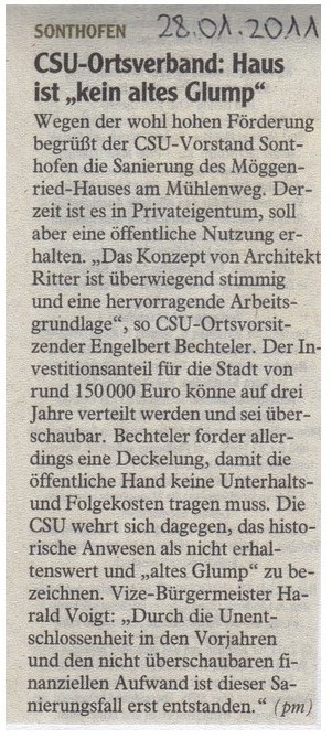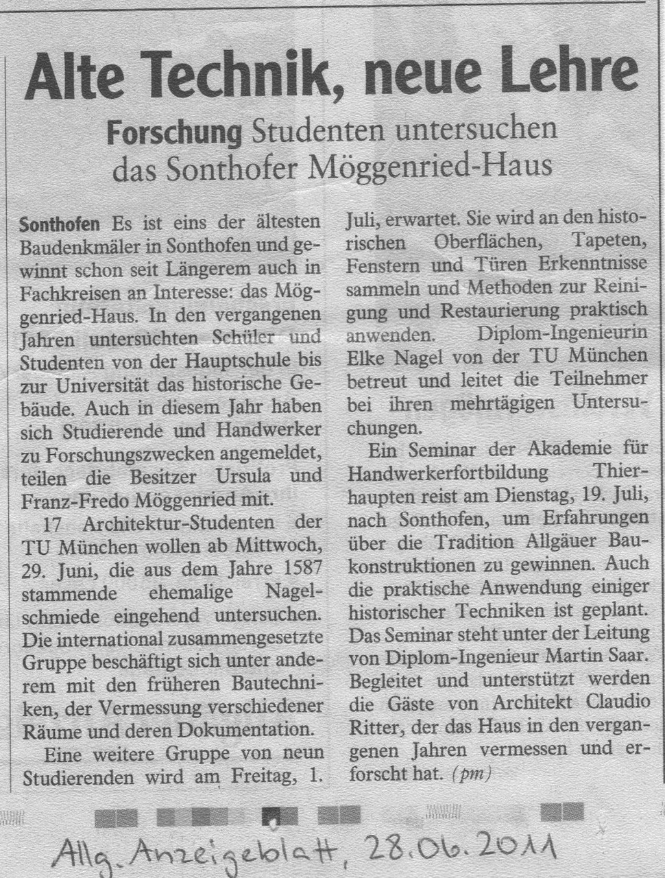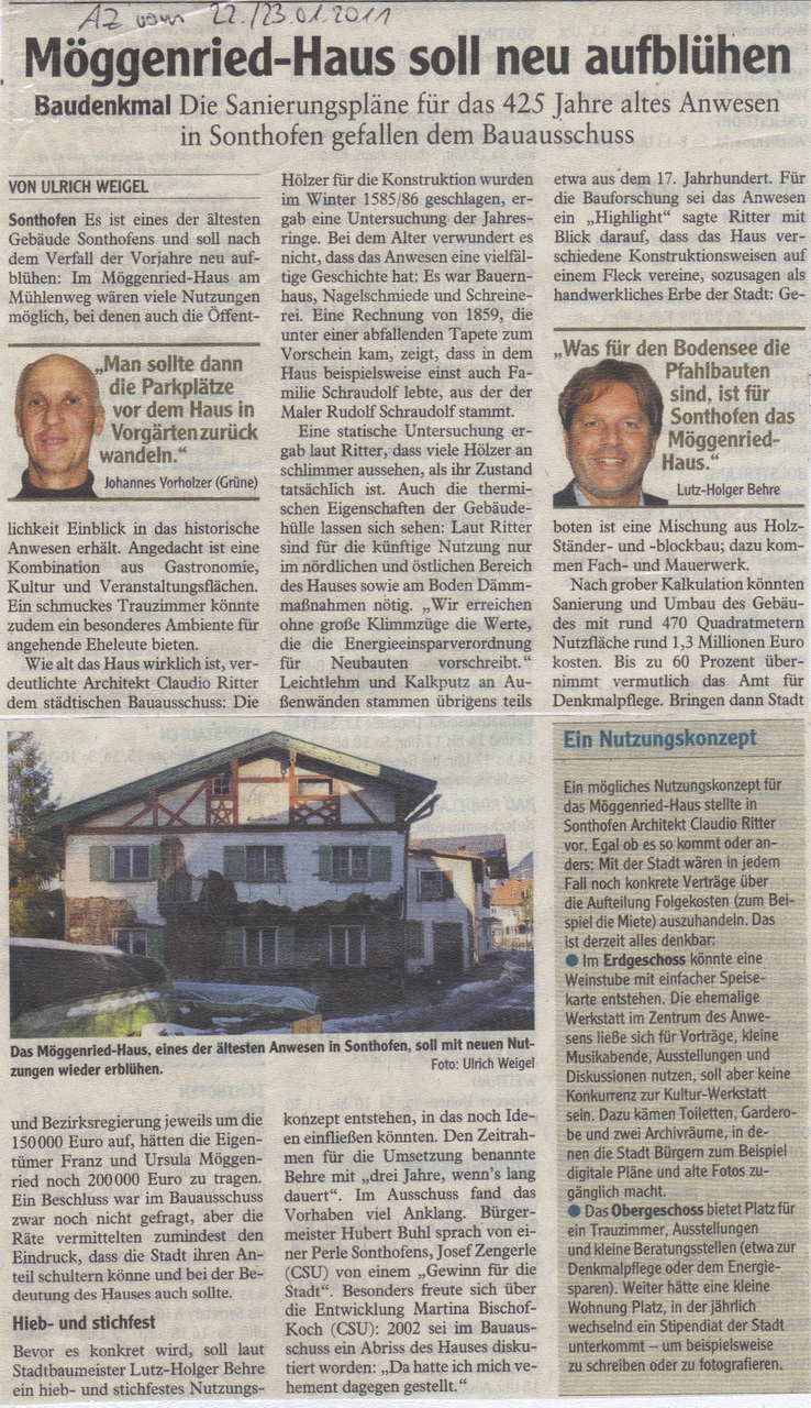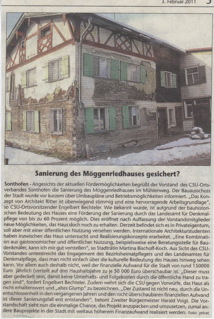 Zu Jahresbeginn erörterte Herr Ritter in einem Vortrag vor dem städtischen Bauausschuss und des Kulturbeirats die Ergebnisse der Voruntersuchungen und der dabei entdeckten konstruktiven Besonderheiten des Möggenried-Hauses und die sich im Zusammenhang ergebende besondere historische Bedeutung des ältesten Hauses Sonthofens, der letzten sonthofener Nagelschmiede sowie des Geburtshauses Robert Schraudolphs, des namhaften Sonthofener Kunstmalers. Auch die Förderaussichten und Möglichkeiten einer künftigen Nutzung stellte der Herr Ritter dar.