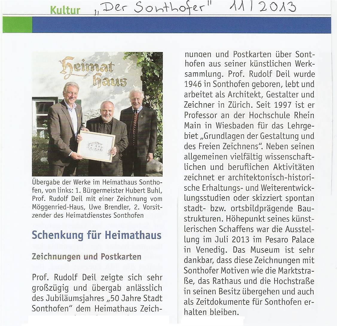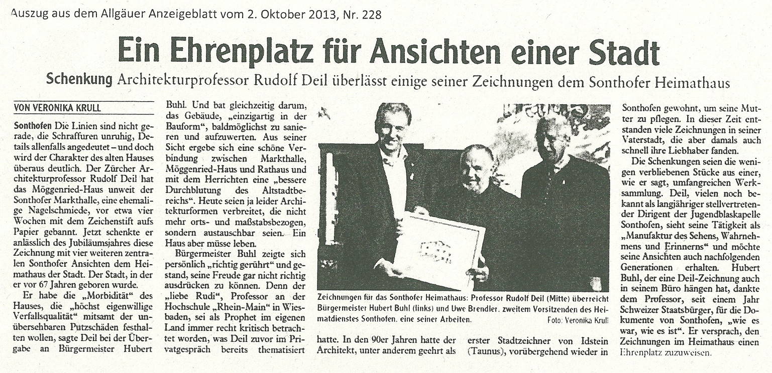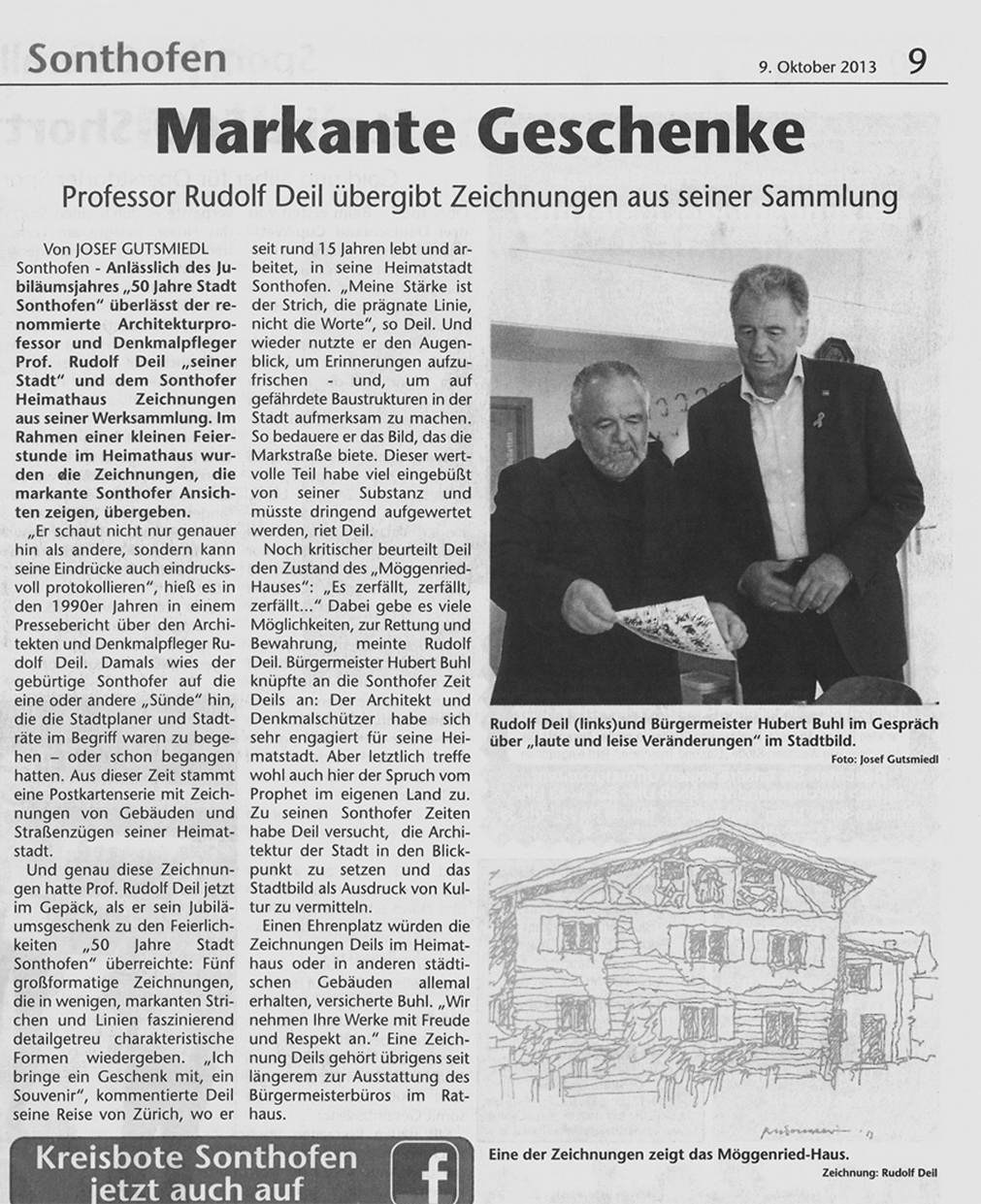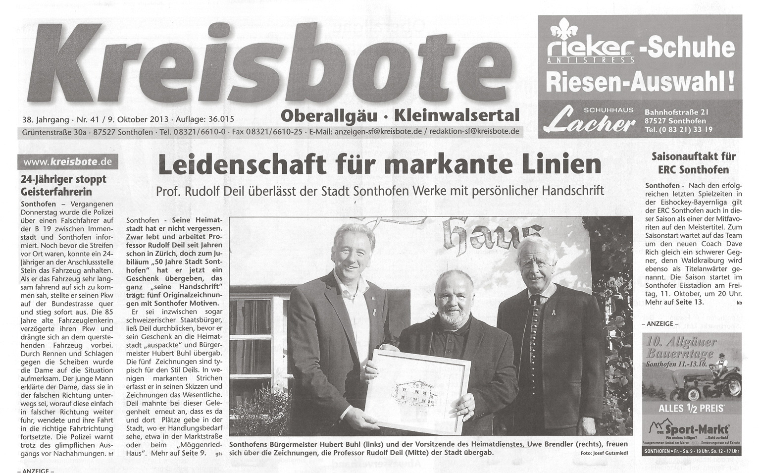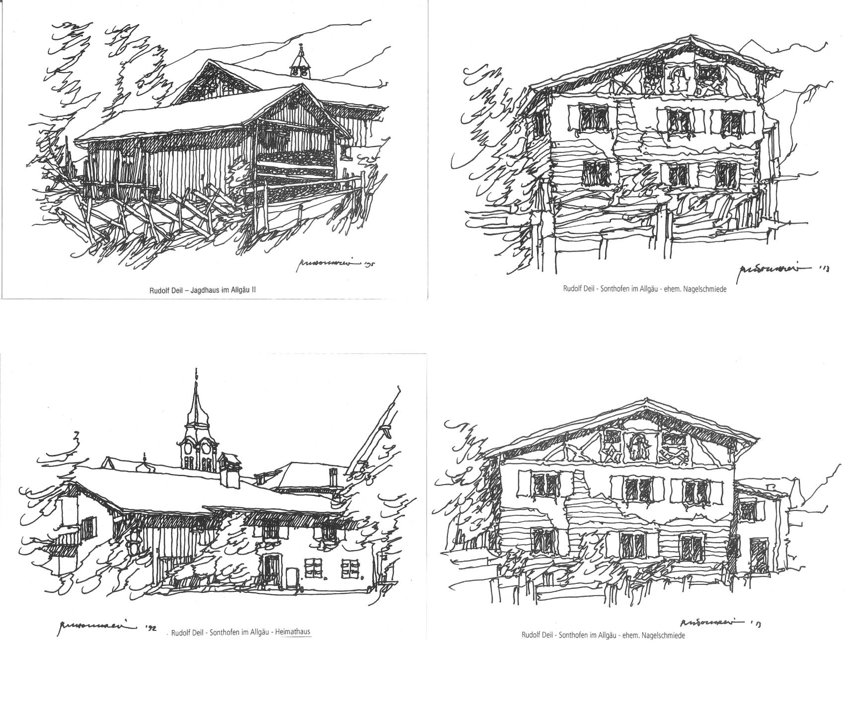 Im Juli, am Tage des Stadtfestes, empfingen wir Herrn Professor Deil. Er überreichte uns zur Begrüßung einige Postkartendrucke seiner genialen Strichzeichnungen, die auch das alte Haus in der aktuell geschädigten Südansicht darstellen. Wie auch uns, liegt Professor Deil als Denkmalpfleger und gebürtigem Sonthofener die Erhaltung und sinnvolle Nutzung des alten Hauses am Herzen. Neben der Besichtigung der Räume bot sich Gelegenheit, die Planungsunterlagen zu den vom Architekten Herrn Vogler entworfenen Nutzungskonzept vorzustellen. Dieses sieht im Erd- und im südlichen Obergeschoss eine gemütliche Weinstube und im hinteren oberen Gebäudeteil eine Betreiberwohnung vor - eine geeignete Nutzung zur Wiederbelebung und Erhaltung der alten Nagelschmiede, woran auch Professor Deil Gefallen fände.