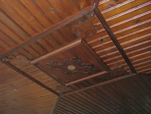 In der Mitte dieses Ornamentes in der Holzdecke in der unteren Stube fehlt eine messingfarbene Rosette.