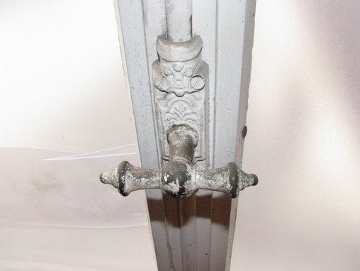 Dieser ornamentierte Fenstergriff ist zu schön, um richtig alt zu sein: um 1900 wurde er eingebaut, als der Stadel zum Wohnraum ausgebaut wurde. Dort, im Fenster oben links, erfüllt er bis heute seine Aufgabe.