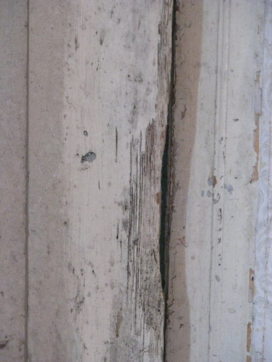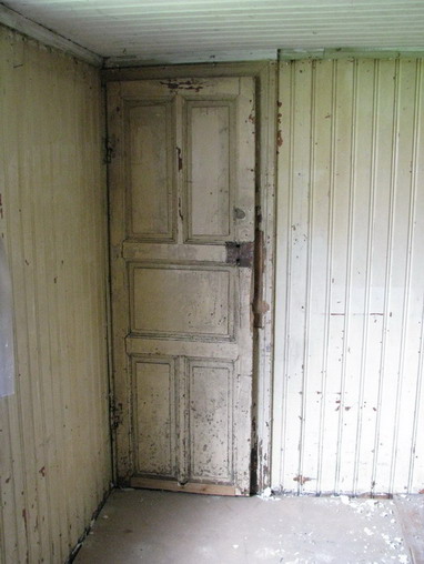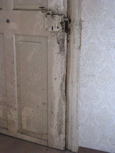 Im Raum, zu dem diese Tür gehört, wohnte in den 50ern und 60ern eine alte Katzenmutter mit ca. 15-20 ihrer Vierbeiner. Die verewigten sich mit ihren Krallen unten im Türblatt.