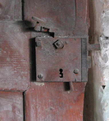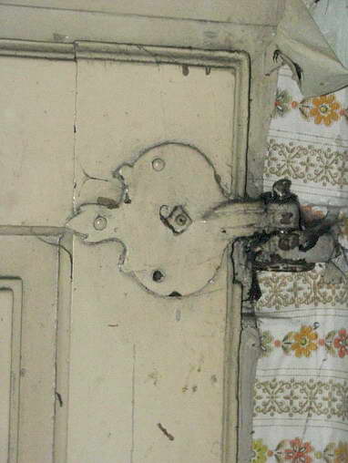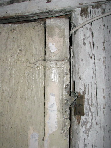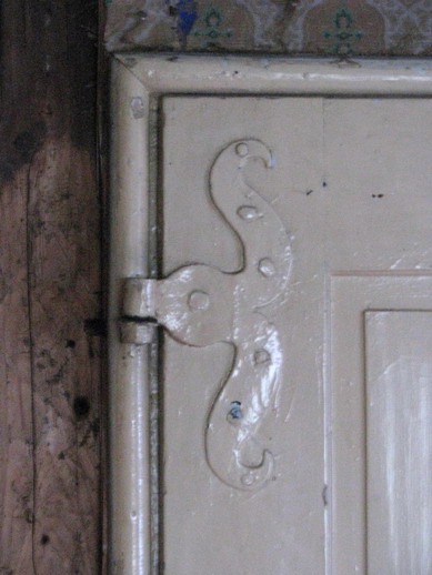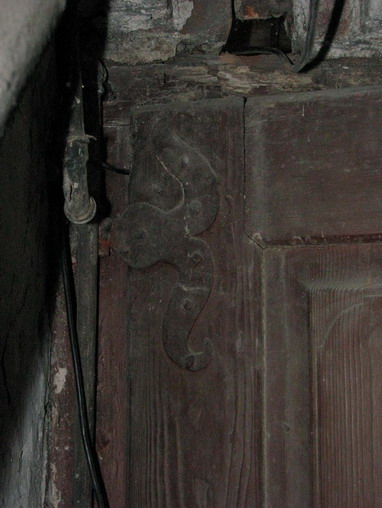 Nur eine gewöhnliche Luke im Soler (Treppenhaus im 1. Stock) wird von diesem altehrwürdigen Beschlag, der vermutlich aus dem 18. Jhrh. stammt, am Rahmen gehalten.