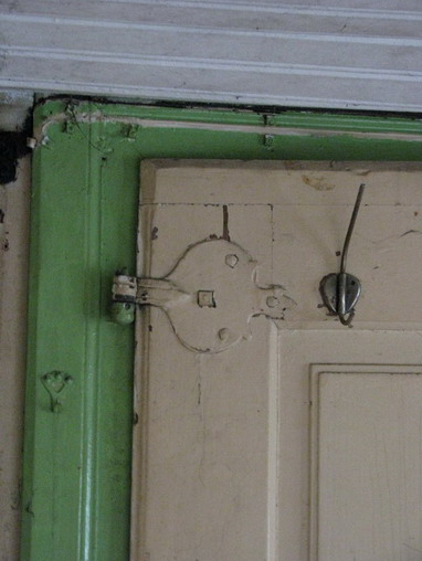 Hier trifft Barock auf die Moderne: an dem neuzeitlichen Haken neben dem alten Türband hängte ein Fräulein, das in den 50ern im Nebenzimmer zur Küche wohnte, ihre Garderobe auf