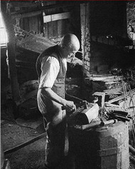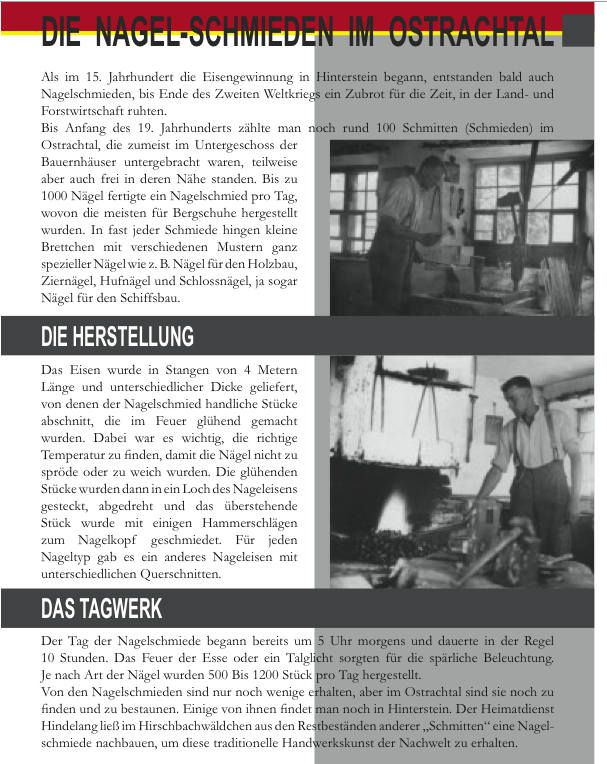 Denk malUnsere ehemalige Nagelschmiede, bekannter unter dem Hausnamen "Möggenried-Haus" im Mühlenweg, ist nicht nur eine bauhistorische Reminiszenz an die vergangenen Jahrhunderte, sondern erinnert auch an das damalige Leben und die bitterarme Bevölkerung, der das Nagelschmiedehandwerk als wichtiger Nebenerwerb zu überleben half. Alter Nagelschmied bei der Arbeit (Bild entlehnt aus einer Seite über das Eisenland Solingen)