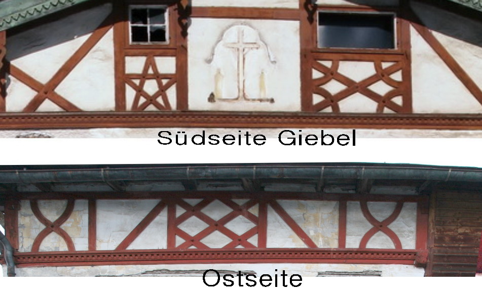 1913 endete die Zeit der Nagelschmiede. Mit neuen Herstellungsmethoden verlor sie ihre Existenzgrundlage. Doch das Haus im Mühlenweg 1 blieb ein Haus des Handwerks. Schreinermeister Friedrich Möggenried bezahlte 8200 Mark für das Gebäude und betrieb darin mit Lohnarbeitern eine Parkett- und Möbelschreinerei. Die ehemalige Nagelschmiede, vormals "beim Ferb" genannt, bekam den Hausnamen "Möggenried-Haus". Friedrich brachte an der Fassade Aufsätze mit diesen Symbolen an, welche dem Haus fortan das charakteristische Aussehen verliehen. Drei Jahre später ließ man auch den inneren Wänden eine neue Ästhetik angedeihen. Übrigens wird das Fünfeck an der südlichen Giebelseite oft fälschlicherweise mit dem Davidstern verwechselt (obwohl der ja sechs Zacken hat). Tatsächlich bezieht sich das Pentagramm und die anderen Symbole aber auf den "Goldenen Schnitt", ein geometrisches Zahlenverhältnis, welches auch für das Schreinerhandwerk von Bedeutung ist.