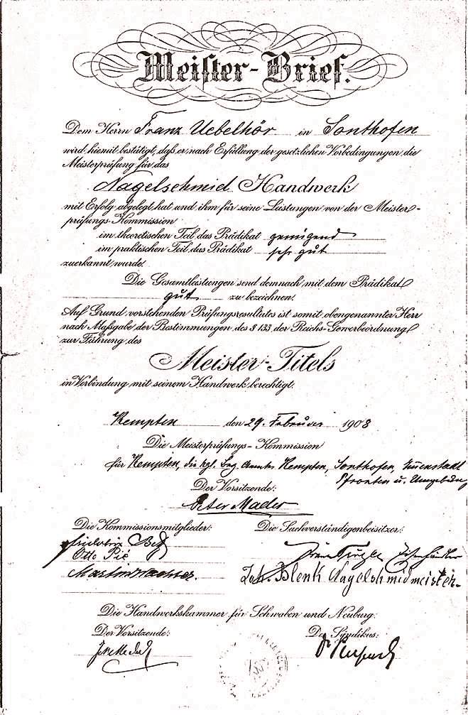 Wie die Vergangenheits- und Familienforschung zeigt, spannt sich ein Bogen von den berühmten Wessobrunner Stuckateuren zu den verwandten Sonthofener Nagelschmieden Anton und Franz Übelhör. Es wird sichtbar, wie sich das handwerkliche und künstlerische Geschick dieser Sonthofener Kinder auf ganz verschiedenen Gebieten segensreich verbreitete. Ihr Fleiß und ihr Wirken werfen noch immer einen Glanz auf ihre Heimat und ihre Wirkungsstätten.
